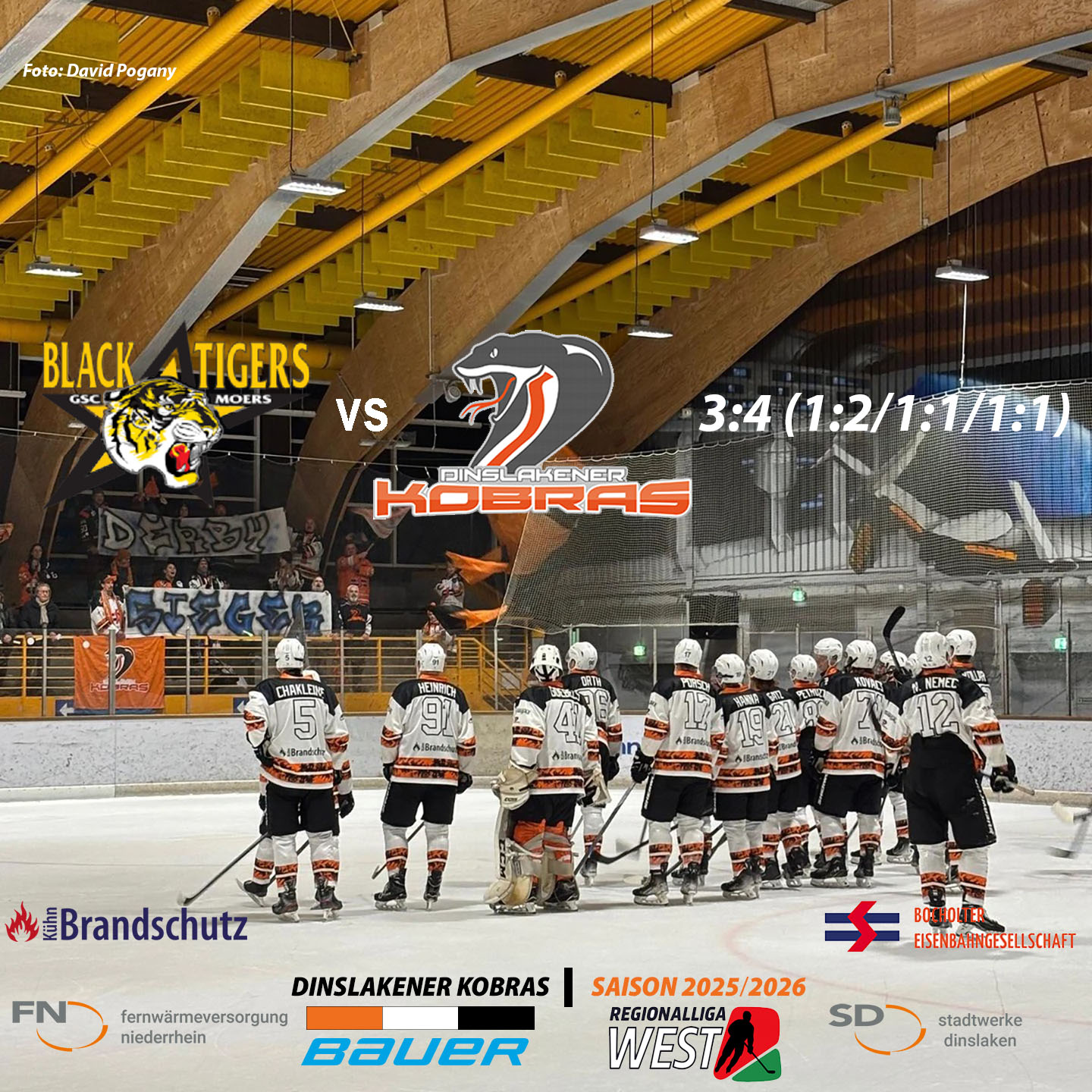 Endlich ist der Knoten geplatzt: Die Dinslakener Kobras haben am Sonntagabend im Derby bei den Black Tigers Moers ihren ersten Saisonsieg in der Regionalliga West eingefahren. Nach einer spannenden und hart umkämpften Partie setzten sich die Giftschlangen mit 4:3 (2:1, 1:1, 1:1) durch – mussten den Erfolg jedoch teuer bezahlen.